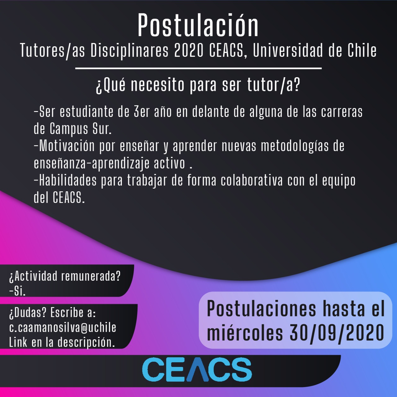Desde el CEACS estamos buscando tutores para diferentes asignaturas. Para poder cursar tu postulación, te debes inscribir en el siguiente enlace: