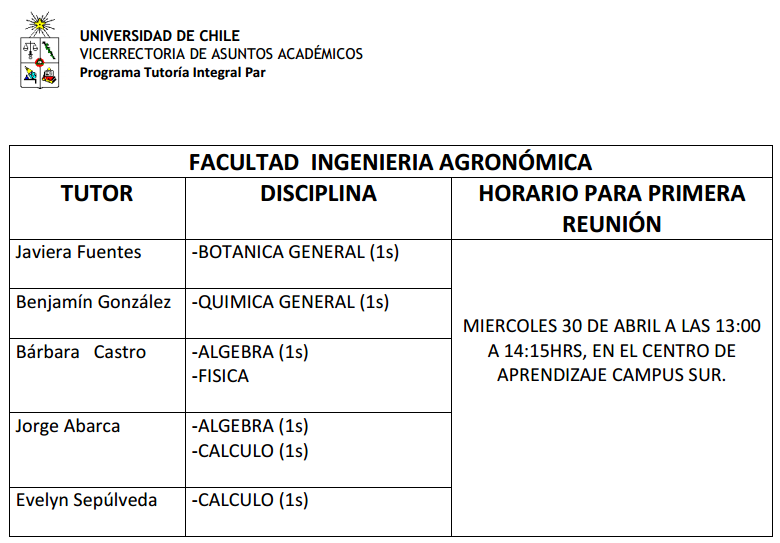 Dirigido sólo para estudiantes de primer año de las carreras de ingienería agronómica e ing. en recursos renovables. El objetivo de este es difundir uno de los dispositivos del Centro de Aprendizaje, llamado Programa de Tutoria Integral Par.