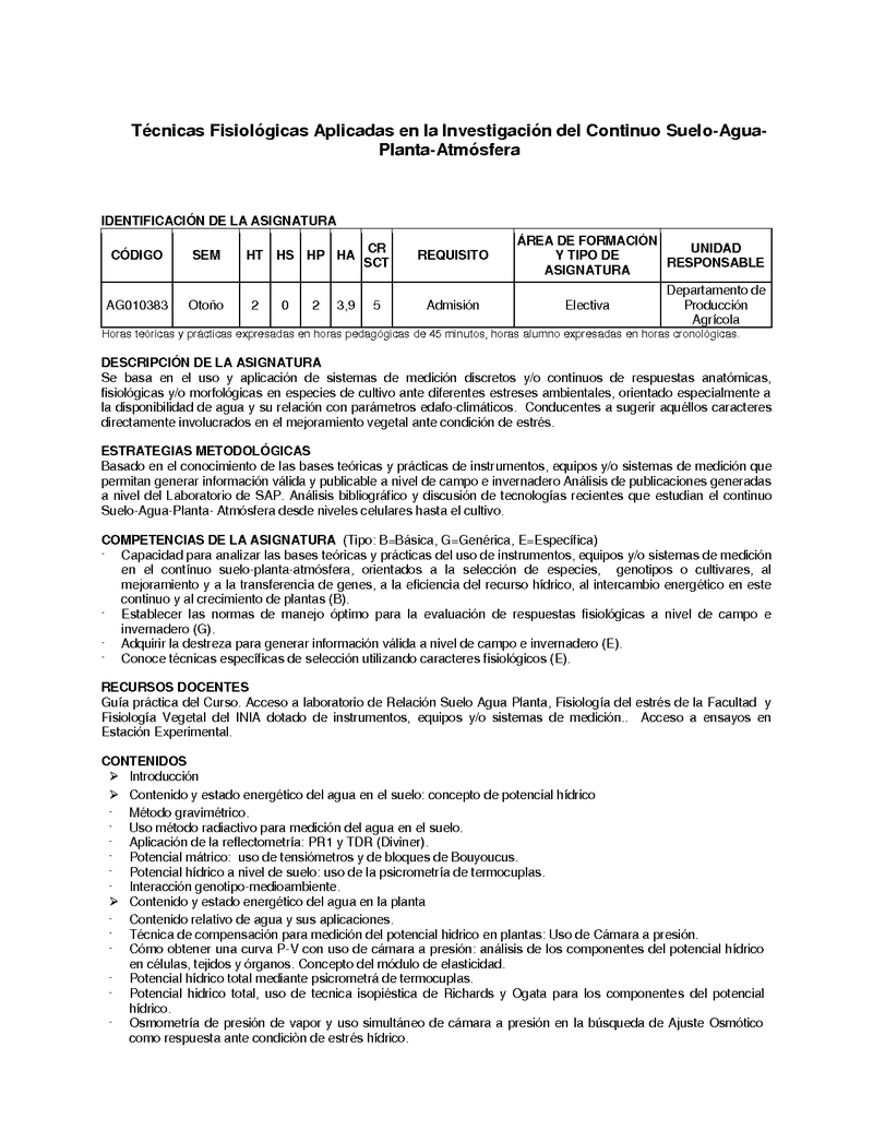 AG010383-1 P--Técnicas Fisiológicas Aplicadas en la Investigación del Continuo Suelo-Agua-Planta-Atmósfera 2015, Segundo Semestre