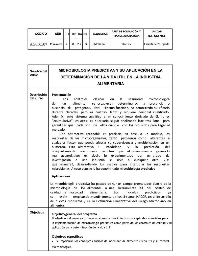 AG050507-1 P--(3)Microbiología Predictiva y su Aplicación en la Determinación de la Vida Útil en la Industria Alimentaria 2017, Segundo Semestre
