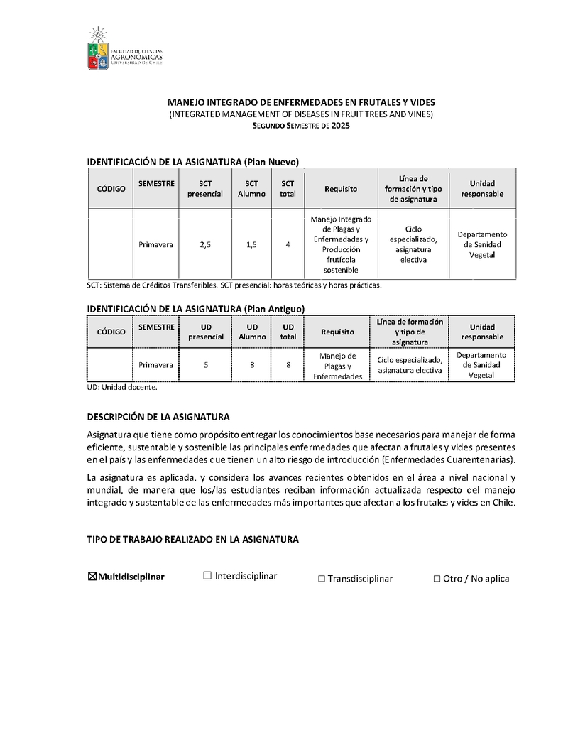 | Descripción | Estimados (as) estudiantes sean bienvenidos al curso de Manejo Inegrado de enfermedades en Frutales y Vides El principal objetivo del curso es 1) Entregarles los conocimientos fundamentales que les permitirán Manejar de manera integrada pero, sostenible, las principales enfermedades que afectan a frutales y vides en Chile y a nivel Mundial. 2) Que sean capaces de reconocer, diagnosticar de manera certera las causas u origenes de las enfermedades, y con ello, puedan junto a nosotros seguir protegiendo el Patrimonio Fitosanitario de Chile. 3) Durante el curso, nos preocuparemos de que se generen vínculos de conexión entre ustedes y las enpresas públicas como privadas que visitaremos, de manera tal de que conozcan más de cerca su quehacer y las posiblidades futuras como potenciales fuentes de trabajo. El programa del curso se encuentra en la carpeta de Material docente del curso Atte Marcela Esterio Prof. Resp. Curso |