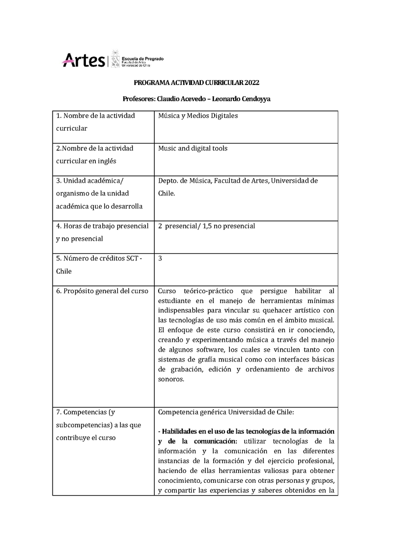 | Descripción | Curso teórico-práctico que persigue habilitar al estudiante en el manejo de herramientas mínimas indispensables para vincular su quehacer artístico con las tecnologías de uso más común en el ámbito musical. El enfoque de este curso consistirá en ir conociendo, creando y experimentando música a través del manejo de algunos software, los cuales se vinculen tanto con sistemas de grafía musical como con interfaces básicas de grabación, edición y ordenamiento de archivos sonoros. |