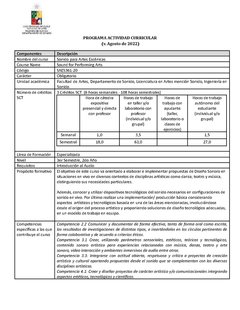 | Descripción | El objetivo de este curso va orientado a elaborar e implementar propuestas de Diseño Sonoro en situaciones en vivo en diversos contextos de disciplinas artísticas como danza, teatro y música, distinguiendo sus necesidades particulares. Además, conocer y utilizar dispositivos tecnológicos del sonido necesarios en configuraciones de sonido en vivo. Por último realizar una implementación/ producción básica considerando aspectos artísticos y tecnológicos basada en una de las áreas mencionadas, involucrándose desde el origen del proceso artístico y proponiendo soluciones de diseño tecnológico adecuadas, en un modelo de trabajo en equipo. |