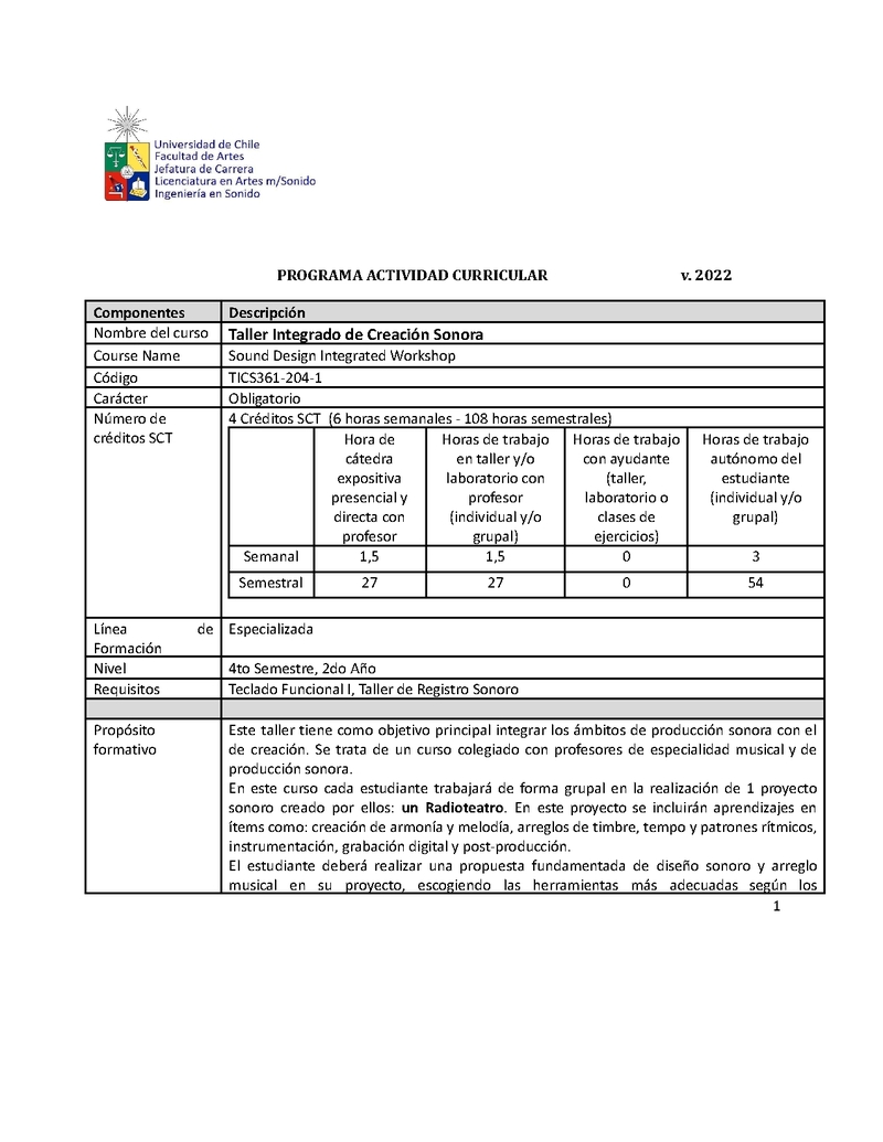 | Descripción | Este taller tiene como objetivo principal integrar los ámbitos de producción sonora con el de creación. Se trata de un curso colegiado con profesores de especialidad musical y de producción sonora. En este curso cada estudiante trabajará de forma grupal en la realización de 1 proyecto sonoro creado por ellos: un Radioteatro. En este proyecto se incluirán aprendizajes en ítems como: creación de armonía y melodía, arreglos de timbre, tempo y patrones rítmicos, instrumentación, grabación digital y post-producción. El estudiante deberá realizar una propuesta fundamentada de diseño sonoro y arreglo musical en su proyecto, escogiendo las herramientas más adecuadas según los requerimientos de cada trabajo, de acuerdo a los recursos disponibles. De manera innovadora, argumentada y crítica. |