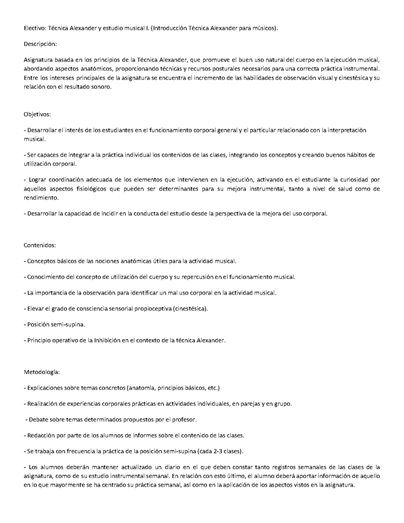 | Descripción | Descripción: Asignatura basada en los principios de la Técnica Alexander, que promueve el buen uso natural del cuerpo en la ejecución musical, abordando aspectos anatómicos, proporcionando técnicas y recursos posturales necesarios para una correcta práctica instrumental. Entre los intereses principales de la asignatura se encuentra el incremento de las habilidades de observación visual y cinestésica y su relación con el resultado sonoro. |