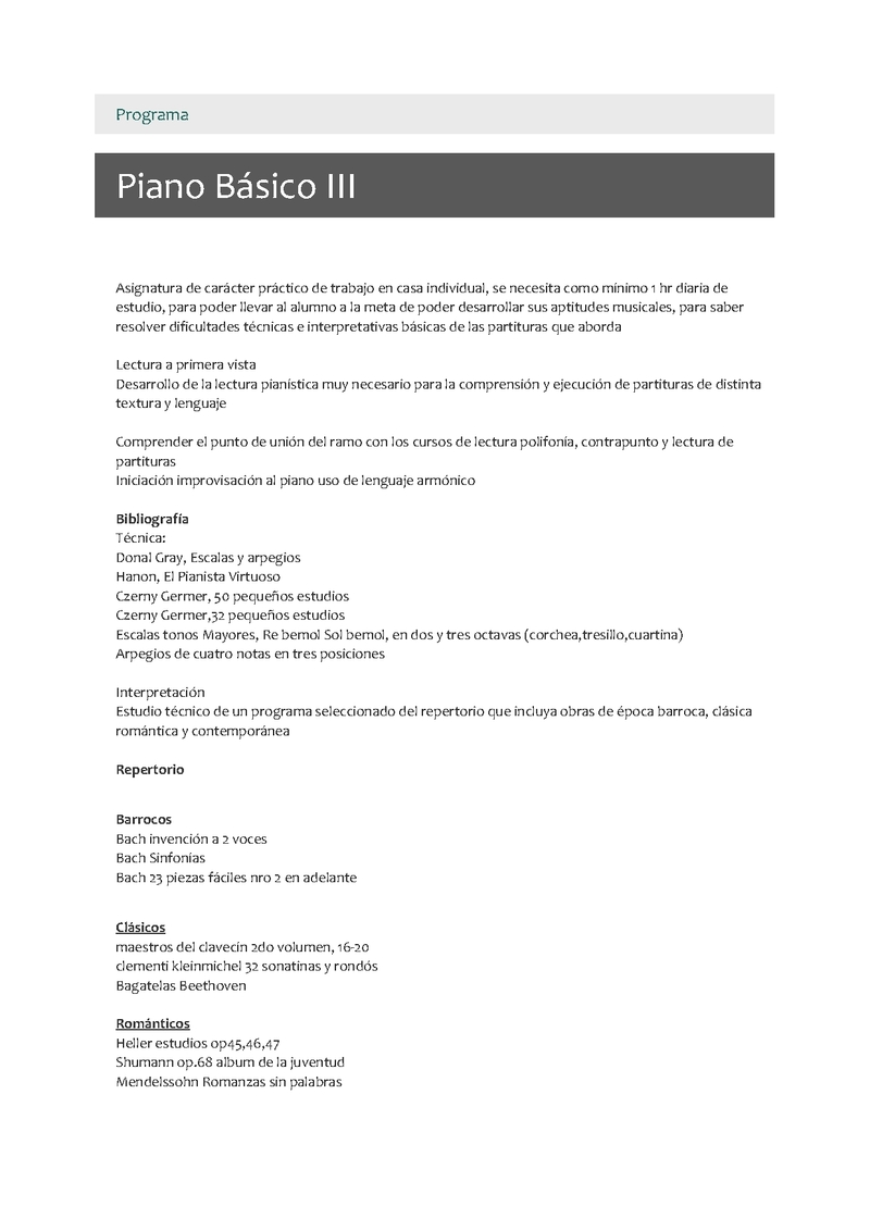 | Descripción | Asignatura de carácter práctico de trabajo en casa individual, se necesita como mínimo 1 hr diaria de estudio, para poder llevar al alumno a la meta de poder desarrollar sus aptitudes musicales, para saber resolver dificultades técnicas e interpretativas básicas de las partituras que aborda Lectura a primera vista Desarrollo de la lectura pianística muy necesario para la comprensión y ejecución de partituras de distinta textura y lenguaje Comprender el punto de unión del ramo con los cursos de lectura polifonía, contrapunto y lectura de partituras Iniciacion improv al piano uso de lenguaje armónico Bibliografía Técnica: Donal Gray, Escalas y arpegios Hanon, El Pianista Virtuoso Czerny Germer, 50 pequeños estudios Czerny Germer,32 pequeños estudios Escalas tonos Mayores, Re bemol Sol bemol, en dos y tres octavas (corchea,tresillo,cuartina) Arpegios de cuatro notas en tres posiciones Interpretación Estudio técnico de un programa seleccionado del repertorio que incluya obras de época barroca, clásica romántica y contemporánea Repertorio Barrocos Bach invención a 2 voces Bach Sinfonías Bach 23 piezas fáciles nro 2 en adelante Clásicos maestros del clavecín 2do volumen, 16-20 clementi kleinmichel 32 sonatinas y rondós Bagatelas Beethoven Románticos Heller estudios op45,46,47 Shumann op.68 album de la juventud Mendelssohn Romanzas sin palabras Modernos Bartok mikrokosmos vol 3/4 Kabalevsky op.27 (8-15) Chilenos El pianista Chileno 1er y 2do vol Allende miniaturas Griegas Amengual Álbum infantil preludios Bisquert juguetería (8-10) Orrego salas piezas simples a elección |