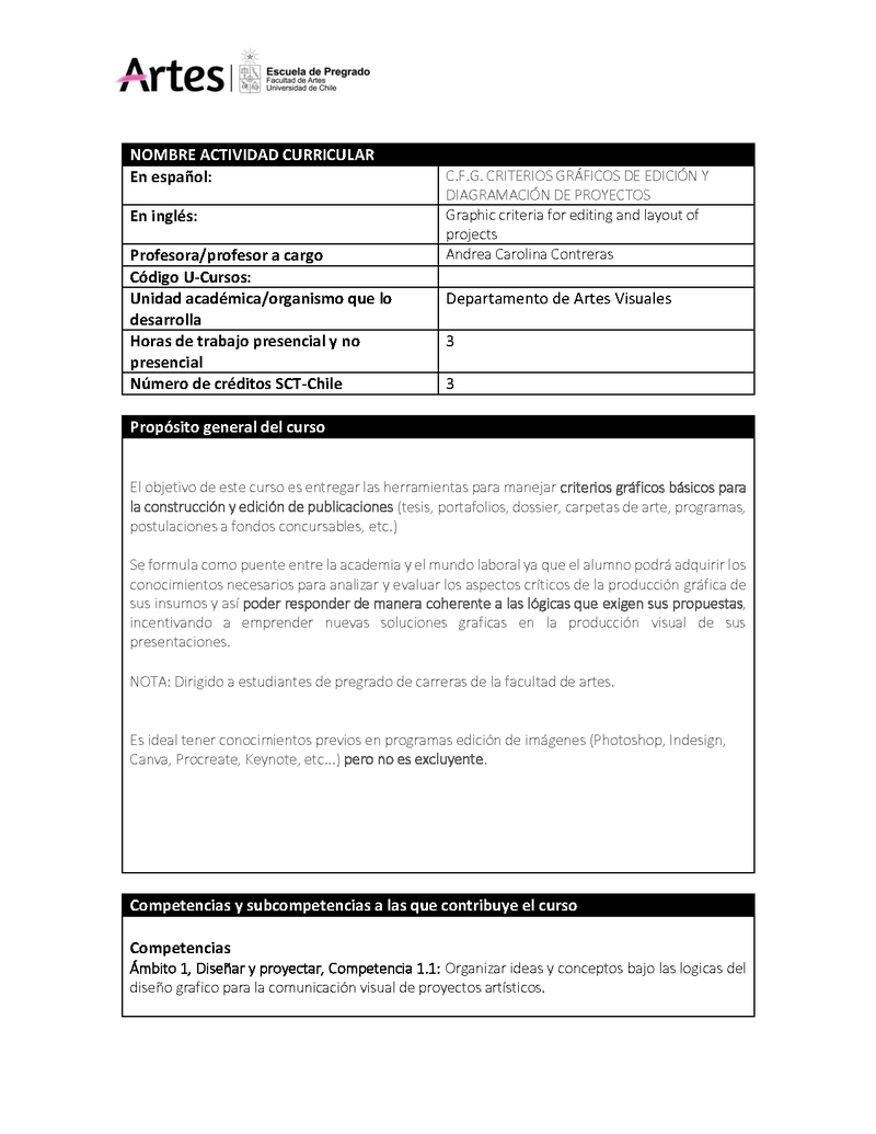 | Descripción | C.E.F.E. / C.E.F.G SEDE PEDRO DE LA BARRA MORANDÉ 750 SALA 21 MARTES 18.00-19.30 HRS El objetivo de este curso es entregar las herramientas para manejar criterios gráficos básicos para la construcción y edición de publicaciones (tesis, portafolios, dossier, carpetas de arte, programas, postulaciones a fondos concursables, etc.) Se formula como puente entre la academia y el mundo laboral ya que el alumno podrá adquirir los conocimientos necesarios para analizar y evaluar los aspectos críticos de la producción gráfica de sus insumos y así poder responder de manera coherente a las lógicas que exigen sus propuestas, incentivando a emprender nuevas soluciones graficas en la producción visual de sus presentaciones. El curso ofrece un programa de carácter teórico-práctico donde trabajaremos de principio a fin la elaboración de su propio portafolio o si lo prefiere la edición de un proyectos artístico a elección, desde el cuerpo o concepto del proyecto mismo (textos, contenido, imágenes) hasta su edición (formato, diagramación, paletas de color, estilos), a modo de laboratorio las mismas correcciones sirven como objeto de estudio durante las sesiones, que irán complementadas con exposiciones de referencias editoriales (publicaciones gráficas: libros, revistas, fanzines, páginas web y portafolios en distintos medios digitales, ejemplos de carpetas de artes actualizadas del campo de publicidad, moda, dirección de arte) con el objetivo de ampliar la perspectiva visual general en torno al diseño gráfico y sus posibilidades. NOTA: Dirigido a estudiantes de pregrado de carreras de la facultad de artes. Es ideal tener conocimientos previos en programas edición de imágenes (Photoshop, Indesign, Canva, Procreate, Keynote, etc...) pero no es excluyente. |