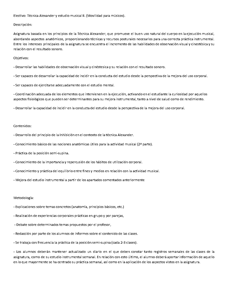 | Descripción | Técnica Alexander es un método de reeducación que desarrolla la consciencia de cómo usamos nuestro cuerpo y mente en las actividades diarias, con el objetivo de abandonar los hábitos psicofísicos perjudiciales y recuperar un funcionamiento natural, libre y saludable. La Técnica Alexander no es una terapia si no una disciplina del campo de la Educación creada a principios del siglo XX y que cuenta con más de cien años de experiencia y de reconocimiento científico. |