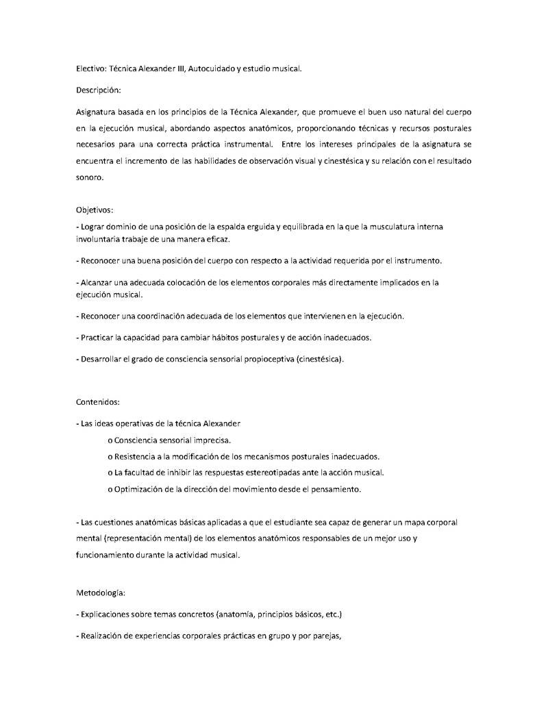 | Descripción | Técnica Alexander es un método de reeducación que desarrolla la consciencia de cómo usamos nuestro cuerpo y mente en las actividades diarias, con el objetivo de abandonar los hábitos psicofísicos perjudiciales y recuperar un funcionamiento natural, libre y saludable. La Técnica Alexander no es una terapia si no una disciplina del campo de la Educación creada a principios del siglo XX y que cuenta con más de cien años de experiencia y de reconocimiento científico. |