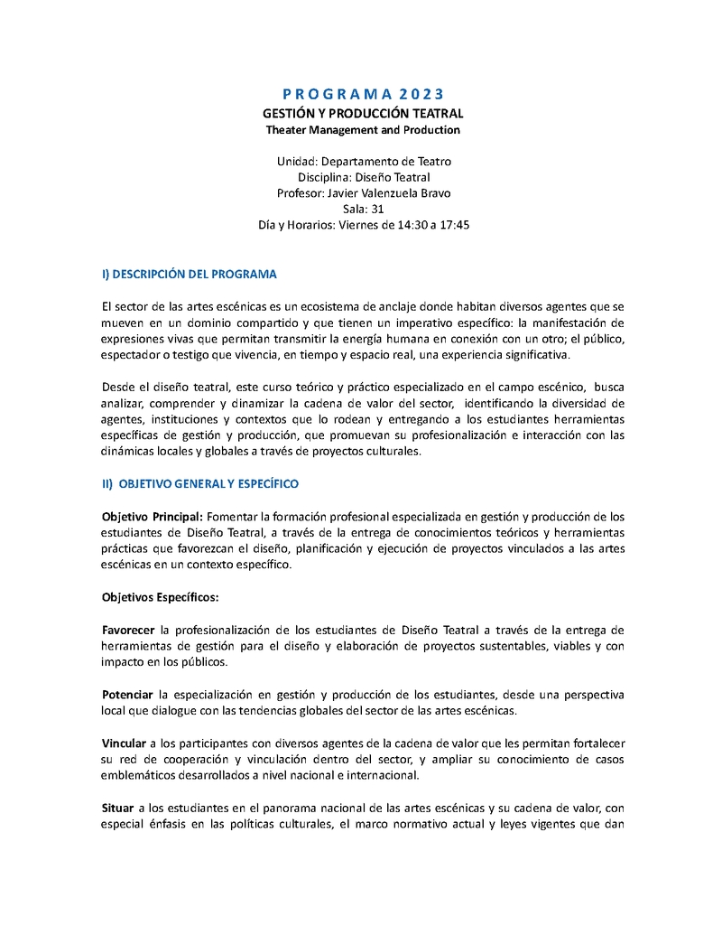 | Descripción | El sector de las artes escénicas es un ecosistema de anclaje donde habitan diversos agentes que se mueven en un dominio compartido y que tienen un imperativo específico: la manifestación de expresiones vivas que permitan transmitir la energía humana en conexión con un otro; el público, espectador o testigo que vivencia, en tiempo y espacio real, una experiencia significativa. Desde el diseño teatral, este curso teórico y práctico especializado en el campo escénico, busca analizar, comprender y dinamizar la cadena de valor del sector, identificando la diversidad de agentes, instituciones y contextos que lo rodean y entregando a los estudiantes herramientas específicas de gestión y producción, que promuevan su profesionalización e interacción con las dinámicas locales y globales a través de proyectos culturales. |