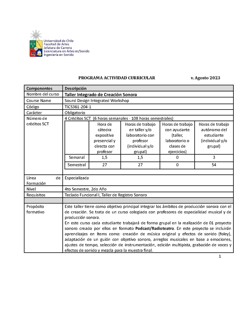 Descripción Este taller tiene como objetivo principal integrar los ámbitos de producción sonora con el de creación. Se trata de un curso colegiado con profesores de especialidad musical y de producción sonora.