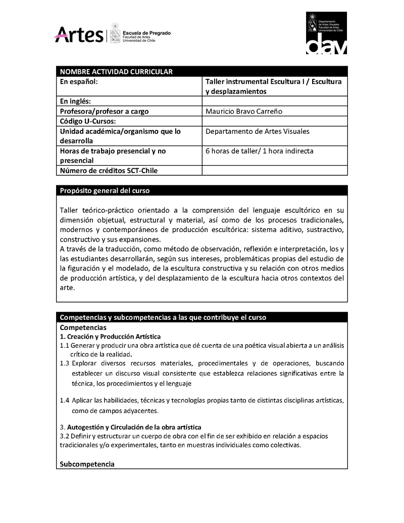 Descripción Programa Instrumental Escultura I. Escultura y desplazamientos. Docente Mauricio Bravo.