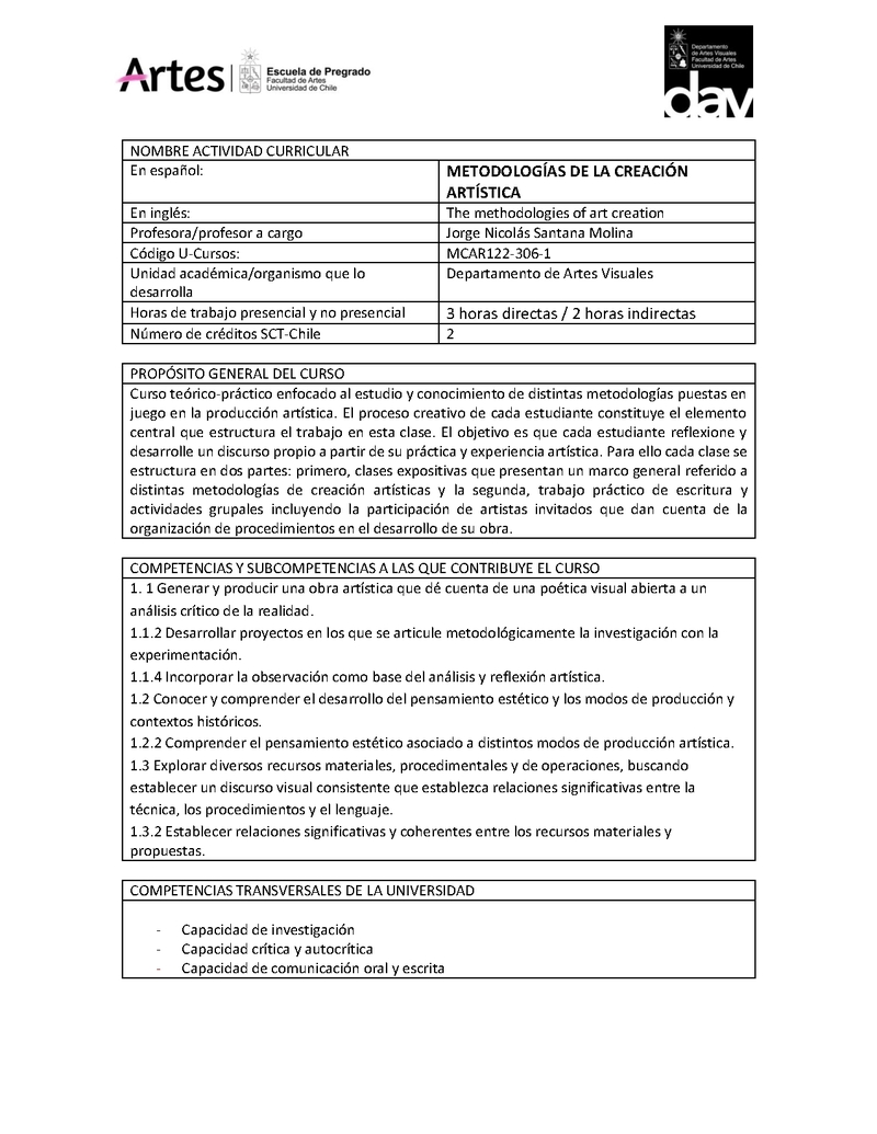 | Descripción | Programa del curso Metodologías de la Creación Artística 2024. | |