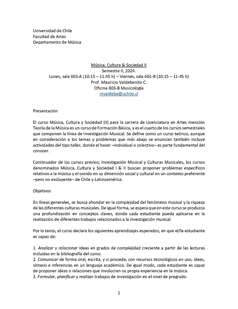 | Descripción | Programa del curso Música, Cultura & Sociedad II, semestre II de 2024. | |