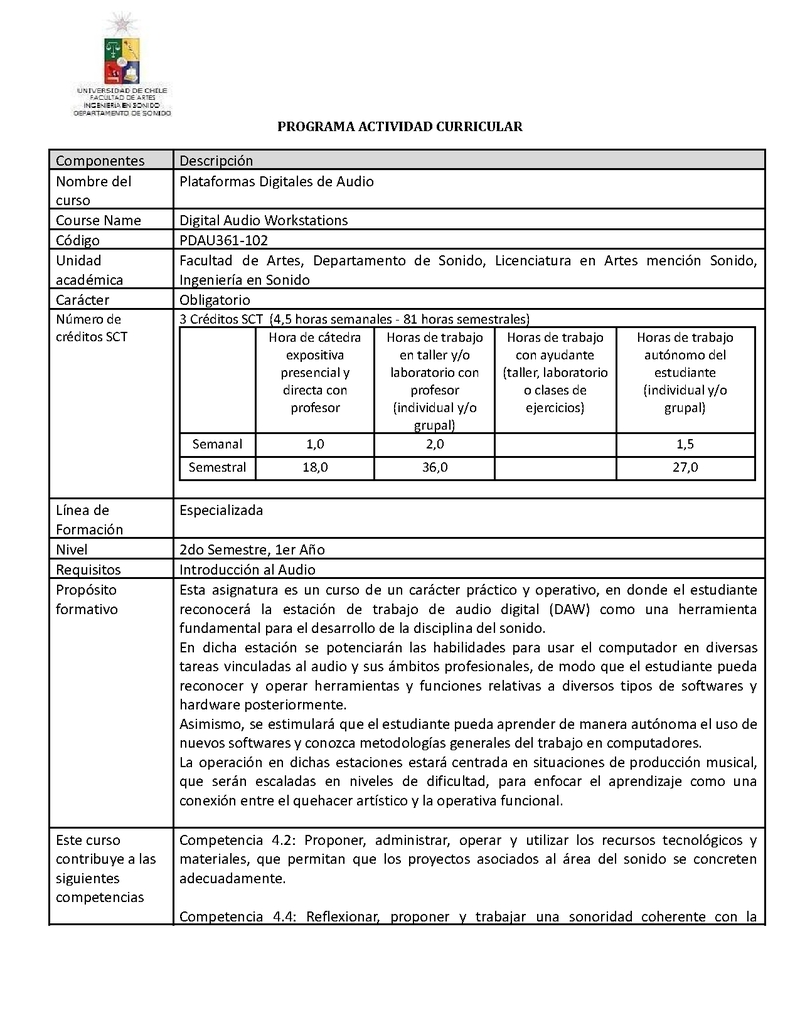 | Descripción | Esta asignatura es un curso de un carácter práctico y operativo, en donde el estudiante reconocerá la estación de trabajo de audio digital (DAW) como una herramienta fundamental para el desarrollo de la disciplina del sonido. En dicha estación se potenciarán las habilidades para usar el computador en diversas tareas vinculadas al audio y sus ámbitos profesionales, de modo que el estudiante pueda reconocer y operar herramientas y funciones relativas a diversos tipos de softwares y hardware posteriormente. Asimismo, se estimulará que el estudiante pueda aprender de manera autónoma el uso de nuevos softwares y conozca metodologías generales del trabajo en computadores. La operación en dichas estaciones estará centrada en situaciones de producción musical, que serán escaladas en niveles de dificultad, para enfocar el aprendizaje como una conexión entre el quehacer artístico y la operativa funcional. |