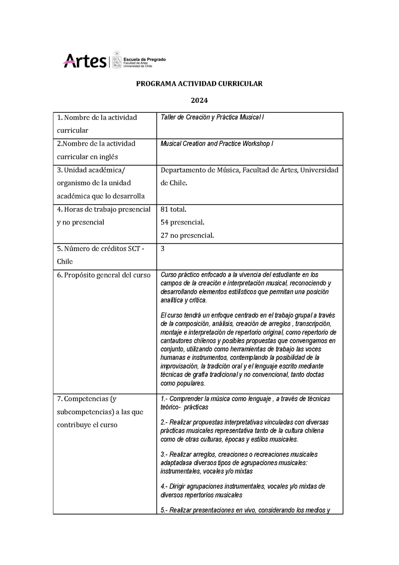 | Descripción | PROGRAMA ACTIVIDAD CURRICULAR 2024 1. Nombre de la actividad curricular Taller de Creación y Práctica Musical I 2.Nombre de la actividad curricular en inglés Musical Creation and Practice Workshop I 3. Unidad académica/ organismo de la unidad académica que lo desarrolla Departamento de Música, Facultad de Artes, Universidad de Chile. 4. Horas de trabajo presencial y no presencial 81 total. 54 presencial. 27 no presencial. 5. Número de créditos SCT - Chile 3 6. Propósito general del curso Curso práctico enfocado a la vivencia del estudiante en los campos de la creación e interpretación musical, reconociendo y desarrollando elementos estilísticos que permitan una posición analítica y crítica. El curso tendrá un enfoque centrado en el trabajo grupal a través de la composición, análisis, creación de arreglos , transcripción, montaje e interpretación de repertorio original, como repertorio de cantautores chilenos y posibles propuestas que convengamos en conjunto, utilizando como herramientas de trabajo las voces humanas e instrumentos, contemplando la posibilidad de la improvisación, la tradición oral y el lenguaje escrito mediante técnicas de grafía tradicional y no convencional, tanto doctas como populares. 7. Competencias (y subcompetencias) a las que contribuye el curso 1.- Comprender la música como lenguaje , a través de técnicas teórico- prácticas 2.- Realizar propuestas interpretativas vinculadas con diversas prácticas musicales representativa tanto de la cultura chilena como de otras culturas, épocas y estilos musicales. 3.- Realizar arreglos, creaciones o recreaciones musicales adaptadasa diversos tipos de agrupaciones musicales: instrumentales, vocales y/o mixtas 4.- Dirigir agrupaciones instrumentales, vocales y/o mixtas de diversos repertorios musicales 5.- Realizar presentaciones en vivo, considerando los medios y características de los intérpretes Subcompetencias 1.- Desarrollar la creatividad musical utilizando técnicas y habilidades teórico prácticas 2.-Desarrollar habilidades teóricas (lectura, armonía), a través de la práctica y la creación 3.- Participar activamente de manera cooperativa, empática y constructiva en los procesos de creación, y de ensamblaje vocal e instrumental. 4.- Desarrollar habilidades técnicas y destrezas tanto desde el aspecto musical como humano para organizar y dirigir pequeñas agrupaciones 5.- Ejecutar el repertorio en una presentación en vivo u online, teniendo en cuenta una adecuada expresión gestual. 8. Resultados de aprendizaje - El estudiante selecciona con criterio un repertorio adecuado. - El estudiante lidera montajes musicales. - El estudiante participa en montajes liderados y dirigidos por otros integrantes del Taller. - El estudiante crea, recrea y adapta música a la realidad, recursos humanos y materiales con los que cuenta el grupo-taller. - El estudiante participa y vivencia la interpretación musical de conjunto. 9. Saberes/contenidos 1. Selección de repertorio - Selección ad-hoc al taller cursado - Toma de acuerdos colectivos de repertorio a interpretar. 2. Montaje de repertorio escogido - Gestión del montaje (partituras, audios, grabaciones, textos, etc.) - Roles (director, compositor, arreglista, instrumentista, cantante, jefe de cuerda, productor musical, etc.) - Composiciones, arreglos musicales, recreaciones o adaptaciones 3. Interpretación de conjunto - Práctica de conjunto. 10. Metodologías Metodología de Taller 11. Evaluación Promedio notas parciales: 60% Nota examen: 40% 12. Requisitos de aprobación Nota mínima 4.0 85% de asistencia. 13. Palabras clave Taller, Música Chilena, Música Latinoamericana, Música popular, Canto Coral 14. Bibliografía obligatoria 15. Bibliografía complementaria |