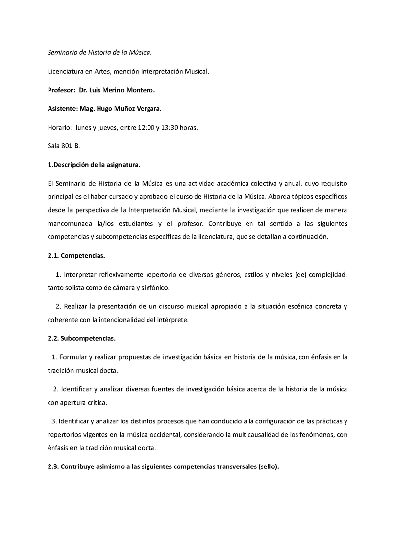 | Descripción | Estimadas y estimados: Junto con saludar, en adjunto envío el programa del Seminario de Historia de la Música a mi cargo, correspondiente a 2025. Atte. Luis Merino Montero |