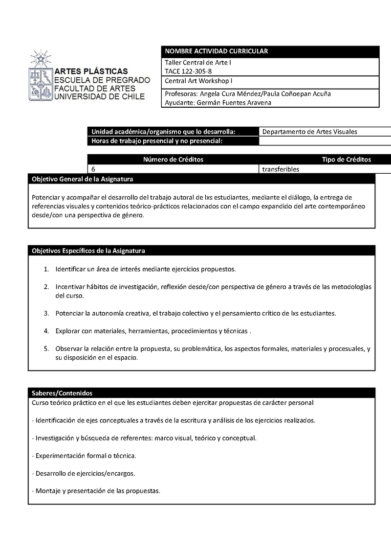 | Descripción | Programa Taller Central de Arte I TACE 122-305 Profesoras: Angela Cura Méndez/Paula Coñoepan Acuña Ayudante: Isabel Aguilera Vera |