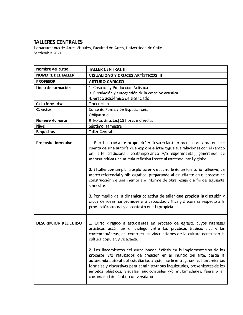 | Descripción | 1. Curso dirigido a estudiantes en proceso de egreso, cuyos intereses artísticos están en el diálogo entre las prácticas tradicionales y las contemporáneas, así como en las vinculaciones de la cultura docta con la cultura popular, y viceversa. 2. Los lineamientos del curso ponen énfasis en la implementación de los procesos y/o resultados de creación en el mundo del arte, desde la autonomía autoral del estudiante, a quien se le entregarán las herramientas formales y discursivas para administrar sus inquietudes, provenientes de los ámbitos plásticos, visuales, audiovisuales y/o multimediales, fuera o en continuidad del ámbito universitario. 3. La metodología docente es personalizada y los recursos bibliográficos se diseñan en función de los intereses creativos del estudiante, en calidad de memorista y postulante a un grado académico. El curso, con carácter de residencia, se imparte en los talleres 19 y 20. 4. Los y las estudiantes de este taller han desarrollado obras en pintura, gráfica, cómics, fan-art, make-up art, ilustración, poesía visual, video-arte, video-games, animaciones, performance, instalaciones, arte sonoro, arte público, arte por internet, museografía y archivo, entre otros. |