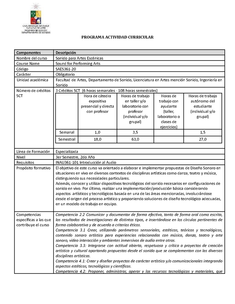 | Descripción | El objetivo de este curso va orientado a elaborar e implementar propuestas de Diseño Sonoro en situaciones en vivo en diversos contextos de disciplinas artísticas como danza, teatro y música, distinguiendo sus necesidades particulares. Además, conocer y utilizar dispositivos tecnológicos del sonido necesarios en configuraciones de sonido en vivo. Por último, realizar una implementación/producción básica considerando aspectos artísticos y tecnológicos basada en una de las áreas mencionadas, involucrándose desde el origen del proceso artístico y proponiendo soluciones de diseño tecnológico adecuadas, en un modelo de trabajo en equipo. |