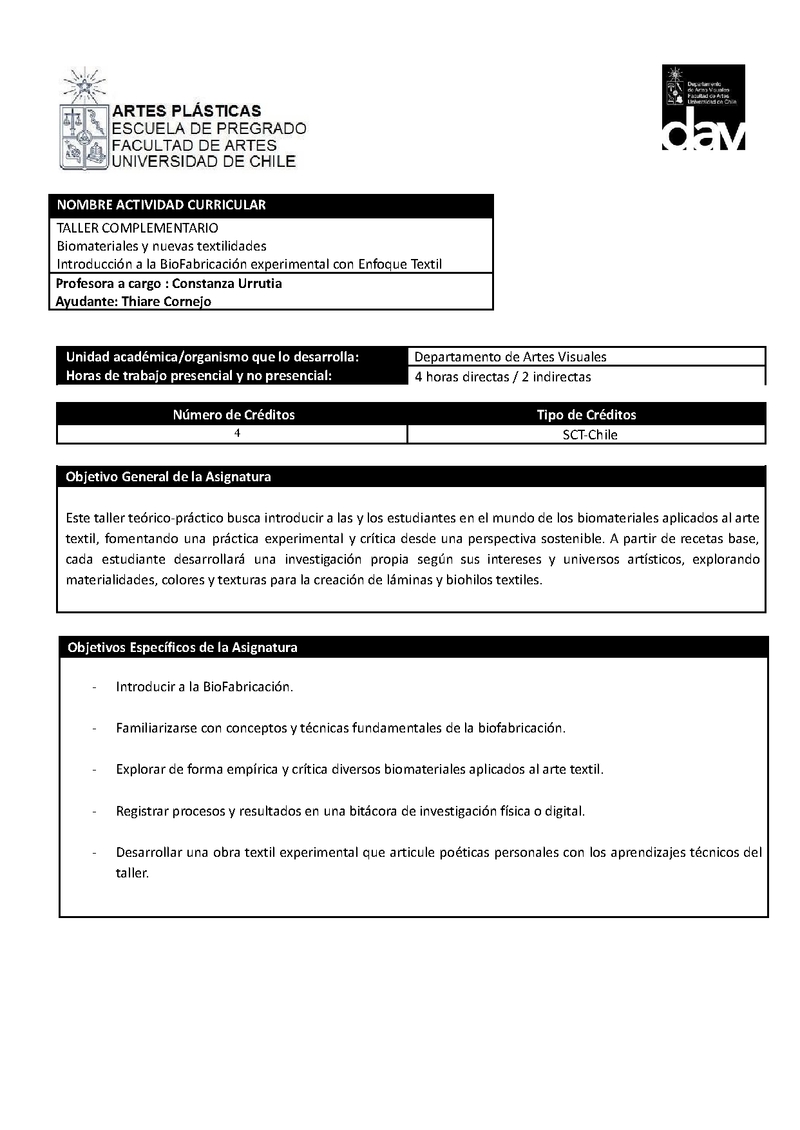 TACO122-030-1 Taller Complementario Textil Biomateriales y Nuevas textilidades 2025, Segundo Semestre