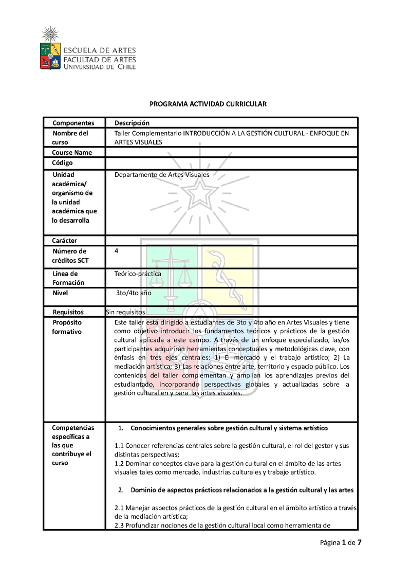 TACO122-035-1 Taller Complementario Introducción a la Gestión Cultural - Enfoque en Artes Visuales 2025, Segundo Semestre
