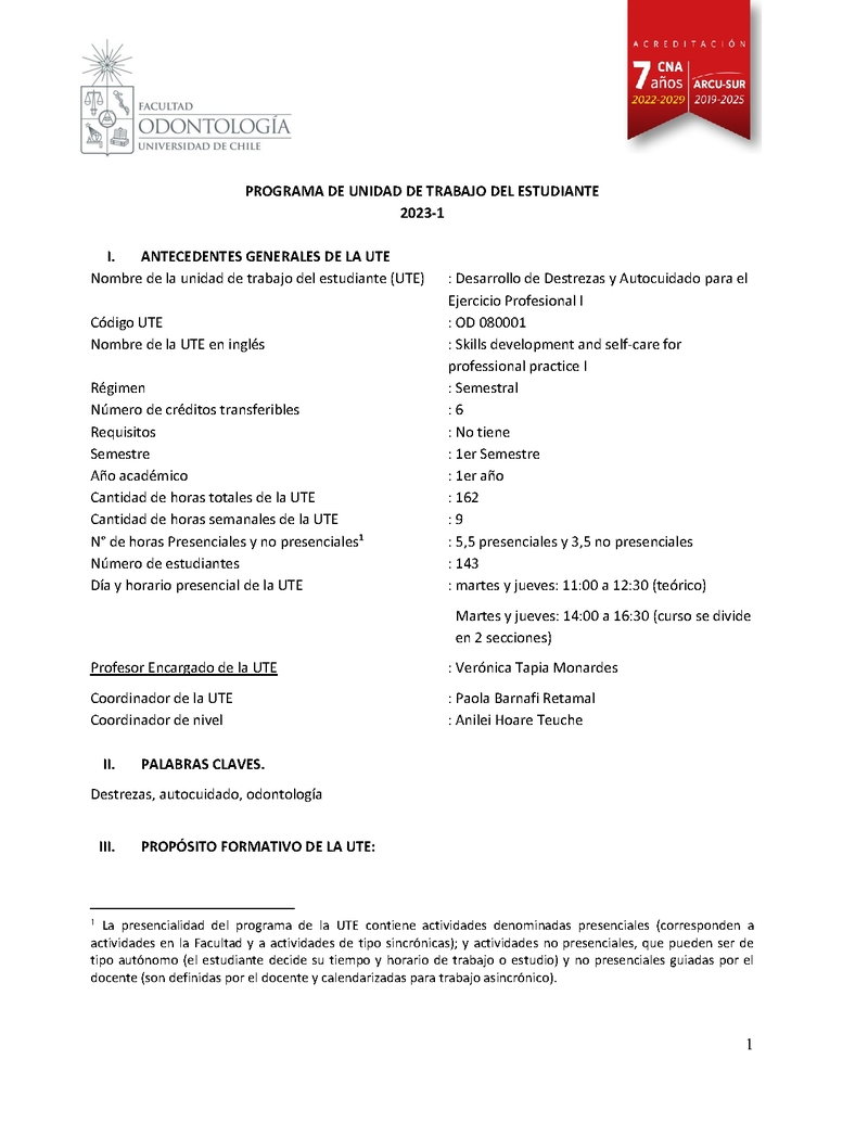 ODON0001-2 Desarrollo de Destrezas y Autocuidado para el Ejercicio Profesional I 2023, Primer Semestre