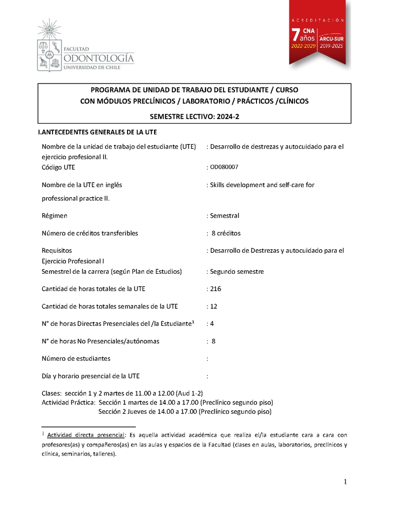 OD080007-1 Desarrollo de Destrezas y Autocuidado para el Ejercicio Profesional II 2024, Segundo Semestre
