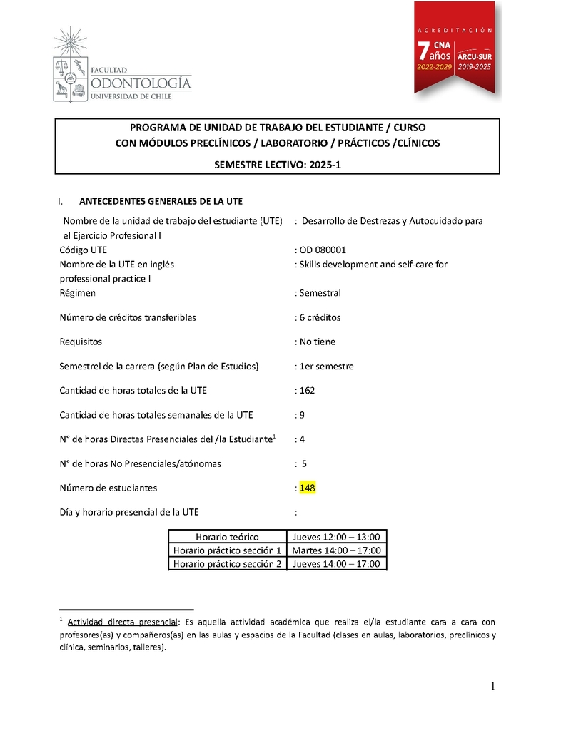 ODON0001-2 Desarrollo de Destrezas y Autocuidado para el Ejercicio Profesional I 2025, Primer Semestre