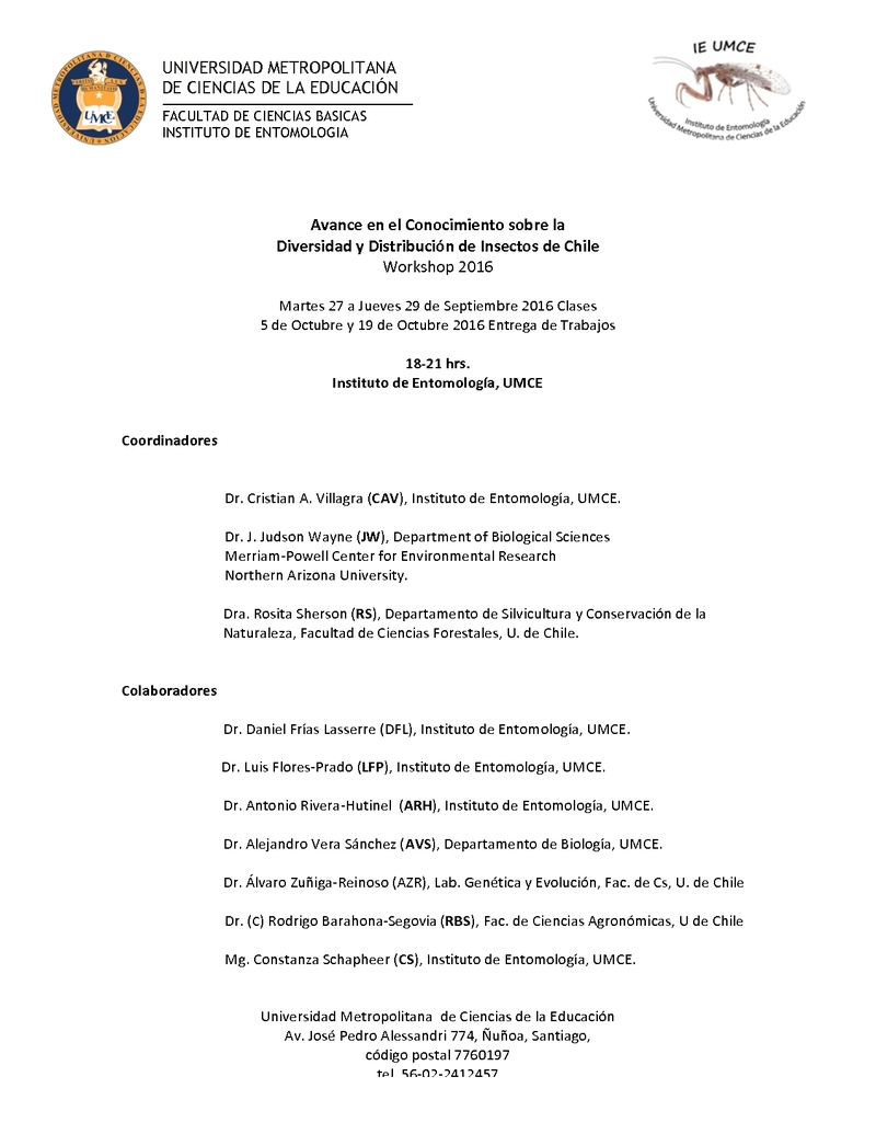 CS06081-1 Avance en el Conocimiento sobre la Diversidad y Distribución de Insectos de Chile - Workshop 2016, Segundo Semestre
