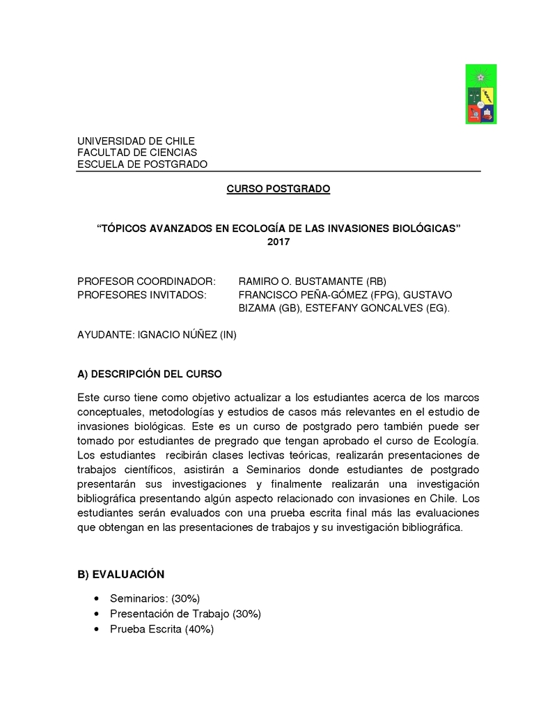 CS07MB0015-1 Tópicos Avanzados de Ecología de las Invasiones Biológicas 2017, Segundo Semestre