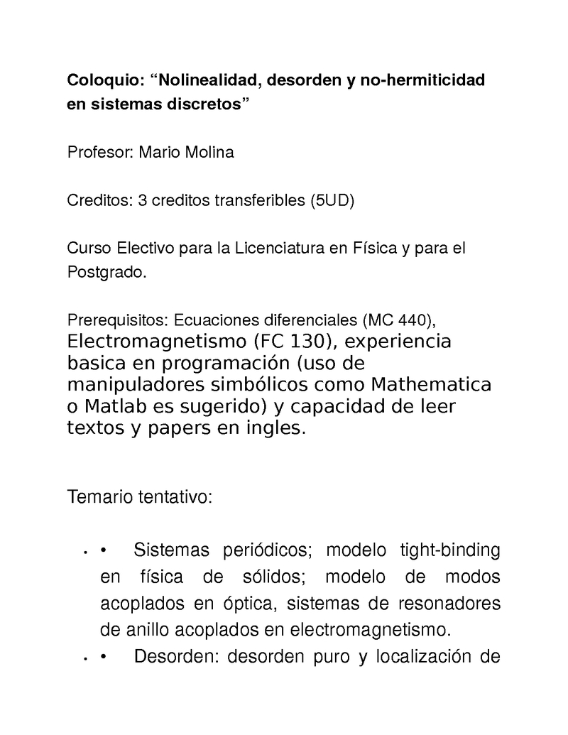 CS07FI0035-1 Coloquio: No linealidad, desorden y no-hermiticidad en sistemas discretos 2019, Segundo Semestre