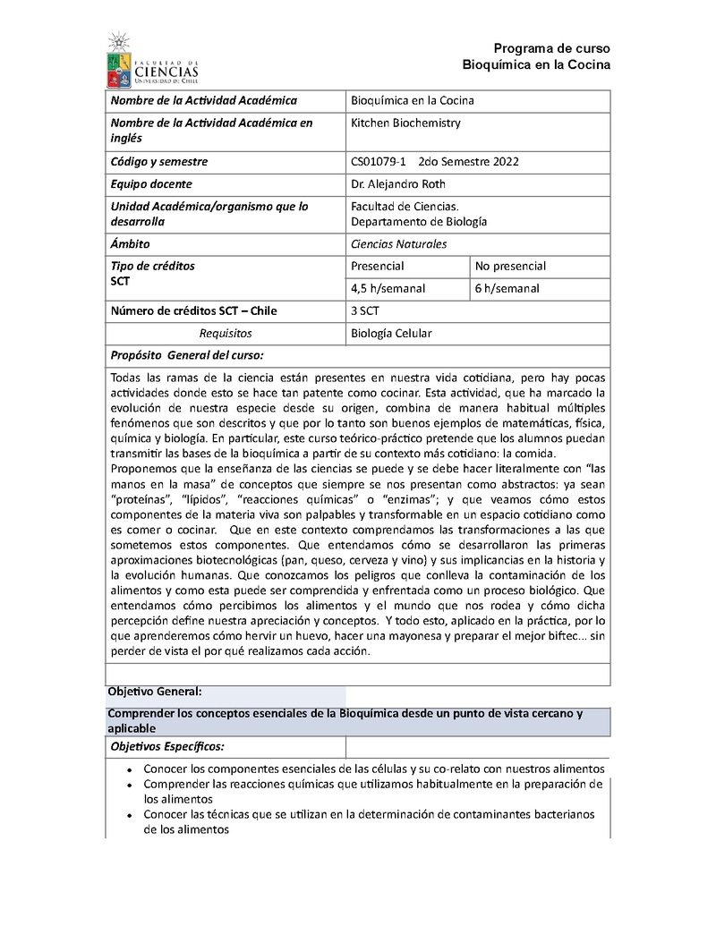 Descripción Todas las ramas de la ciencia están presentes en nuestra vida cotidiana, pero hay pocas actividades donde esto se hace tan patente como cocinar. Esta actividad, que ha marcado la evolución de nuestra especie desde su origen, combina de manera habitual múltiples fenómenos que son descritos y que por lo tanto son buenos ejemplos de matemáticas, física, química y biología. En particular, este curso teórico-práctico pretende que los alumnos puedan transmitir las bases de la bioquímica a partir de su contexto más cotidiano: la comida.