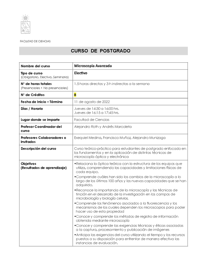 | Descripción | Curso teórico-práctico para estudiantes de postgrado enfocado en los fundamentos y en la aplicación de distintas técnicas de microscopía óptica y electrónica | |