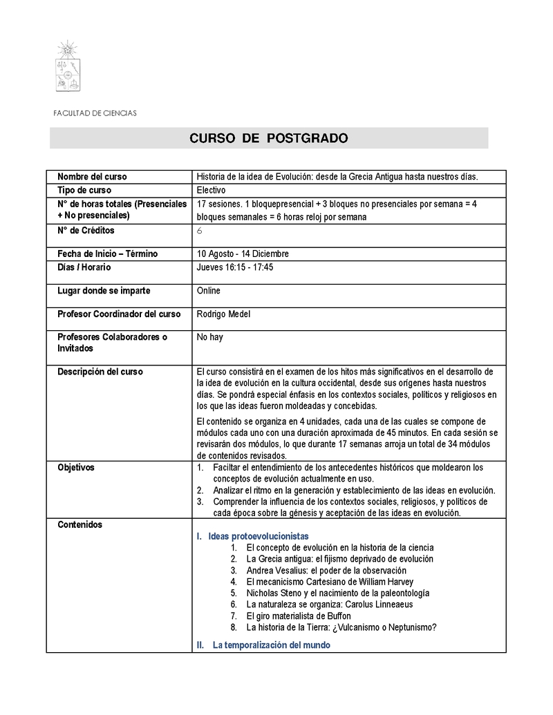 CS07DEBE047-1 Historia de la idea de Evolución: desde la Grecia Antigua hasta nuestros días 2022, Segundo Semestre