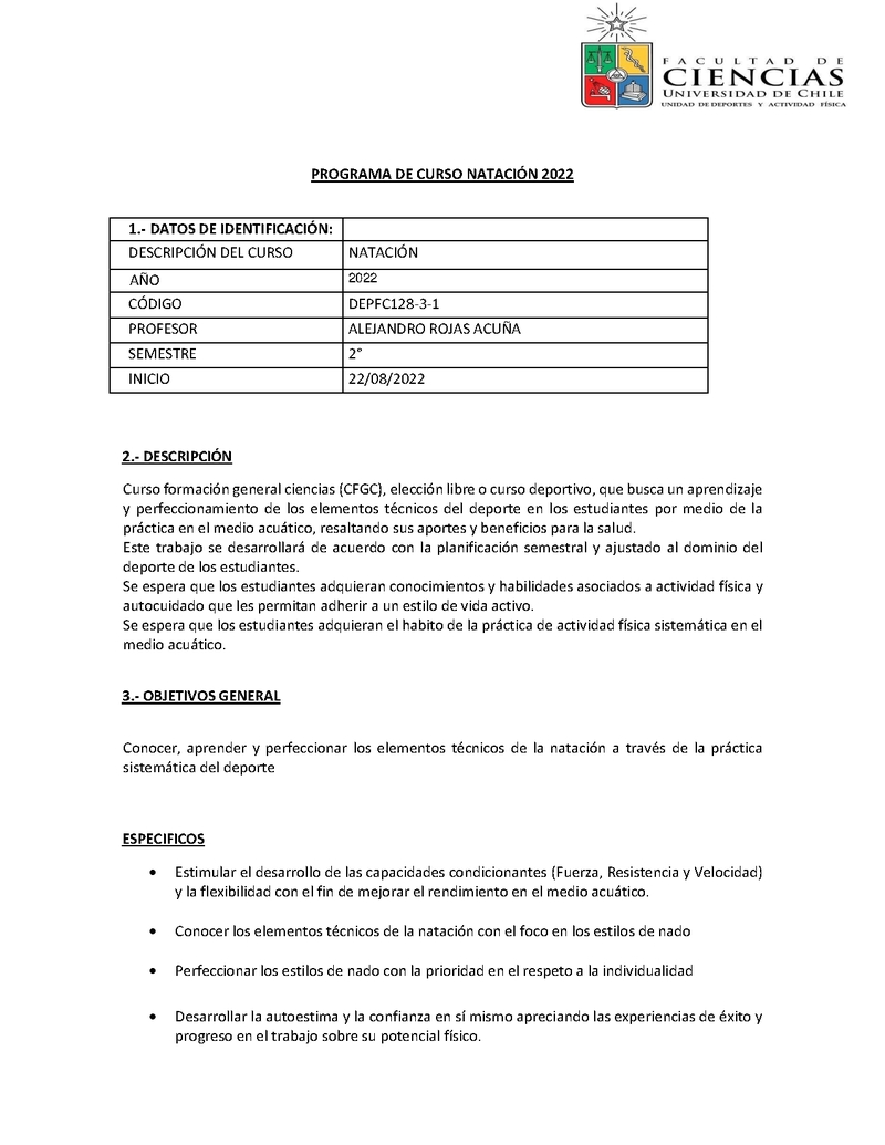 | Descripción | Curso formación general ciencias (CFGC), elección libre o curso deportivo, que busca un aprendizaje y perfeccionamiento de los elementos técnicos del deporte en los estudiantes por medio de la práctica en el medio acuático, resaltando sus aportes y beneficios para la salud. Este trabajo se desarrollará de acuerdo con la planificación semestral y ajustado al dominio del deporte de los estudiantes. Se espera que los estudiantes adquieran conocimientos y habilidades asociados a actividad física y autocuidado que les permitan adherir a un estilo de vida activo. Se espera que los estudiantes adquieran el hábito de la práctica de actividad física sistemática en el medio acuático. |
