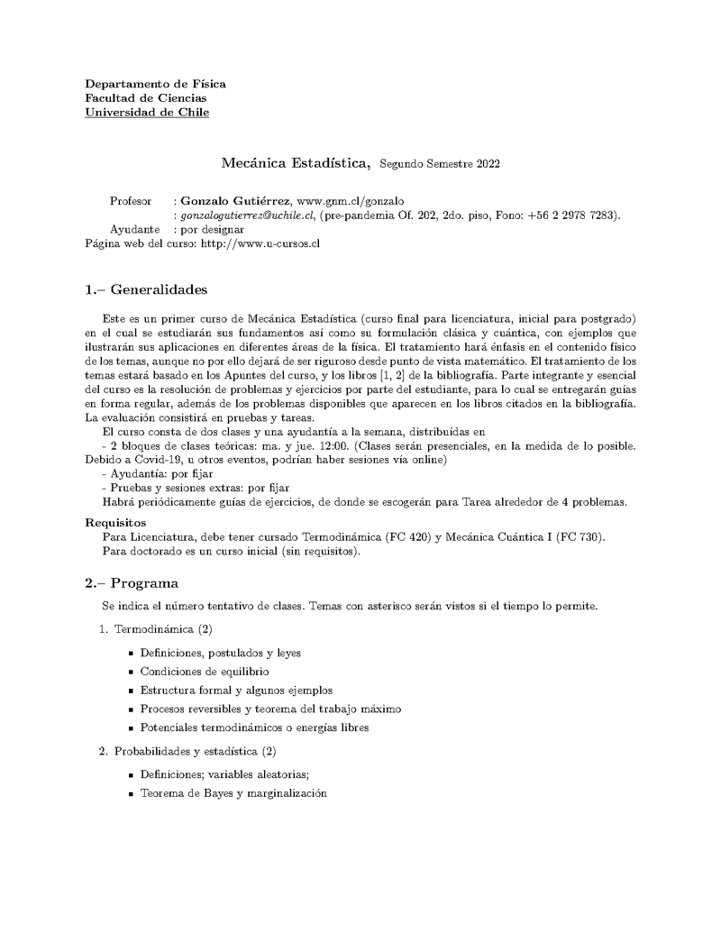 | Descripción | Programa del Curso Mecánica Estadistica Profesor: Gonzalo Gutiérrez - Idea del curso - Pre-requisitos - Temario - Bibliografía - Evaluación |