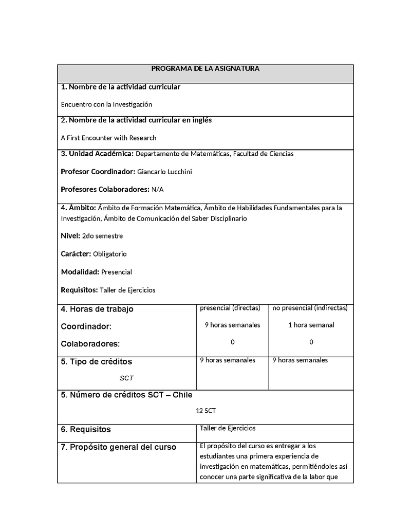 Descripción El propósito del curso es entregar a los estudiantes una primera experiencia de investigación en matemáticas, permitiéndoles así conocer una parte significativa de la labor que pueden llegar a desempeñar tras una carrera en esta área.