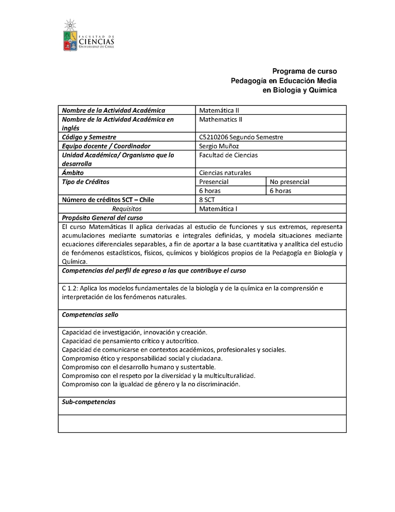 | Descripción | El curso Matemáticas II aplica derivadas al estudio de funciones y sus extremos, representa acumulaciones mediante sumatorias e integrales definidas, y modela situaciones mediante ecuaciones diferenciales separables, a fin de aportar a la base cuantitativa y analítica del estudio de fenómenos estadísticos, físicos, químicos y biológicos propios de la Pedagogía en Biología y Química. |