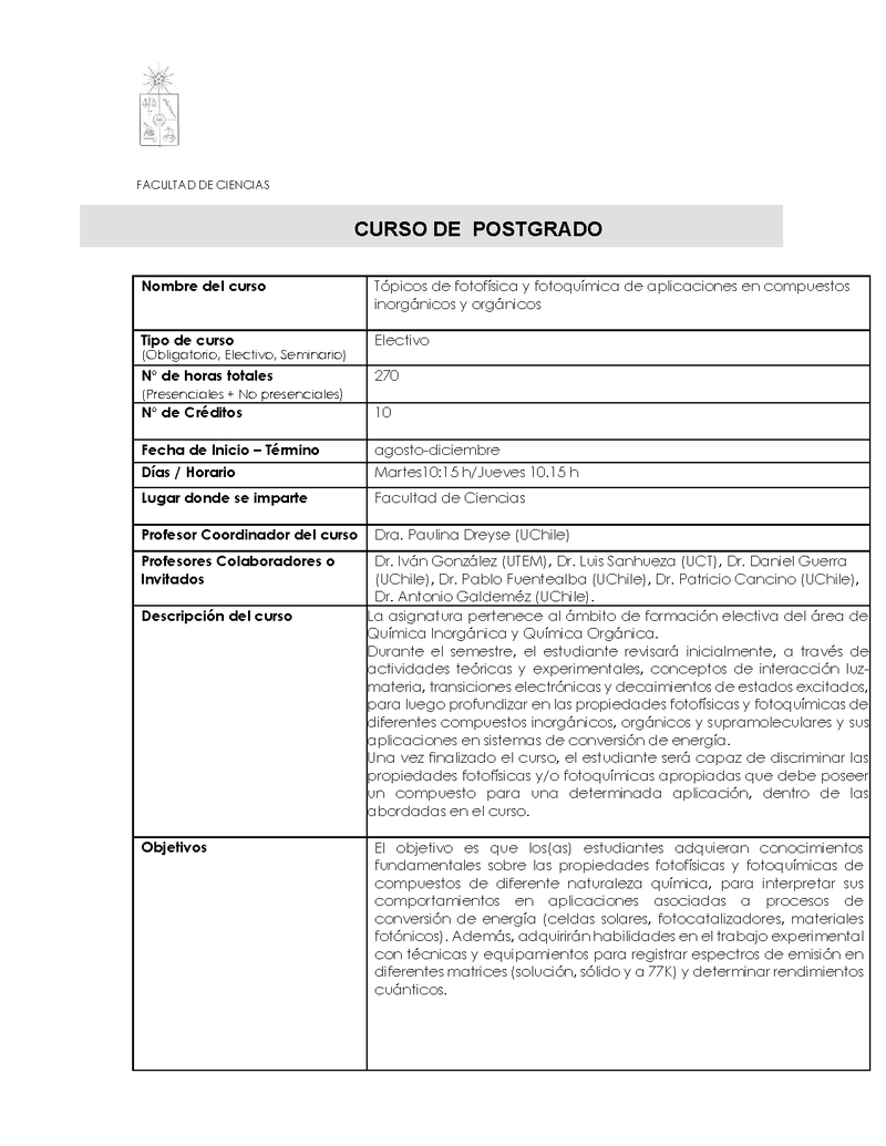 CS07DQ017-1 Tópicos de fotofísica y fotoquímica de aplicaciones en compuestos inorgánicos y orgánicos 2025, Segundo Semestre