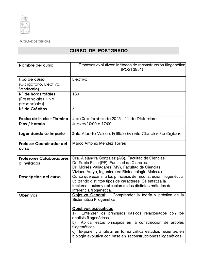 POST3981-1 Procesos evolutivos principios de la reconstrucción filogenética 2025, Segundo Semestre