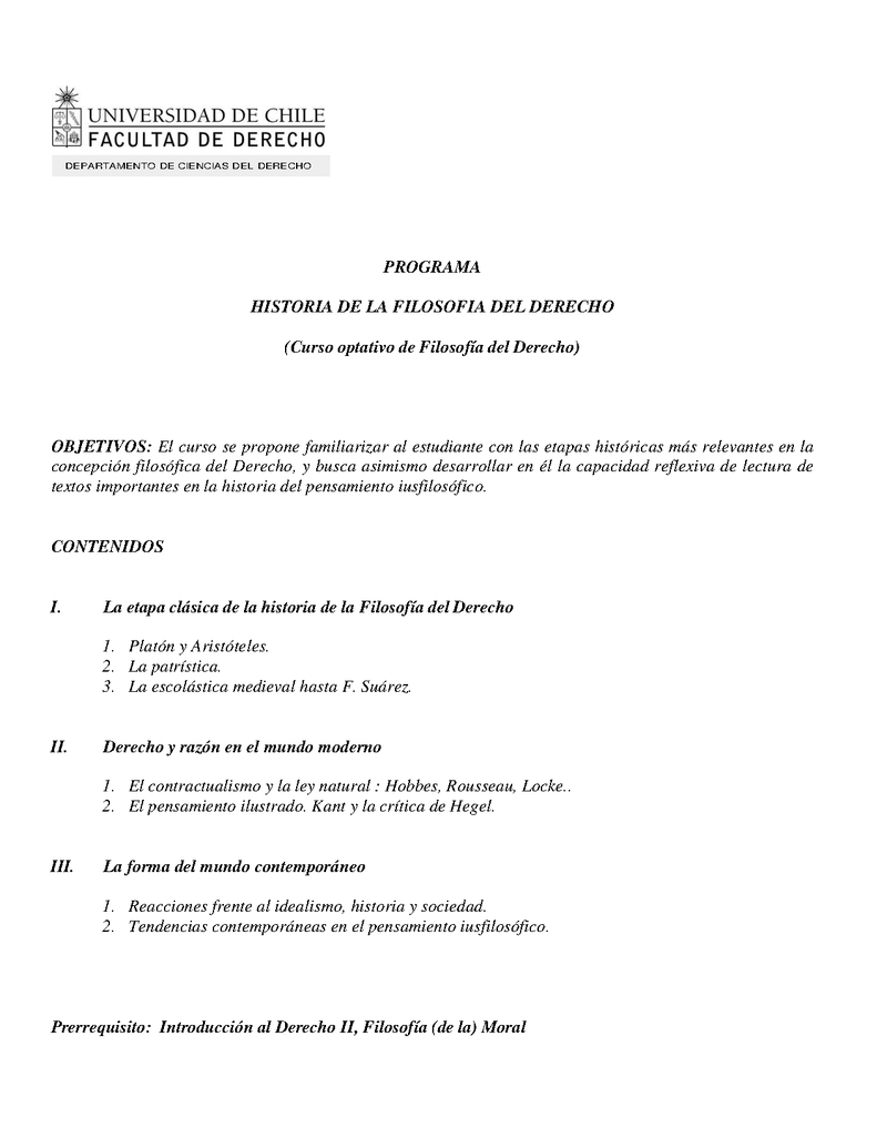 | Objetivos | Acercar al alumno al nacimiento mismo de los problemas filosóficos del Derecho, a sus planteamientos y soluciones a través de dos modos arquetípicos de concebir y aplicar el Derecho, cuales son el positivista y el iusnaturalista. | |