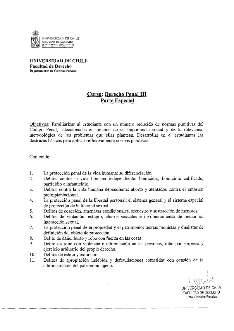 Como una manera de subsanar, aunque sólo parcialmente, los defectos del programa arriba señalados, se hará entrega a los alumnos de un apunte complementario que contiene un estudio resumido de los tipos penales excluidos del programa, teniendo presente, lo que es obvio, que estas materias no serán interrogadas en los controles ni en el examen del ramo.