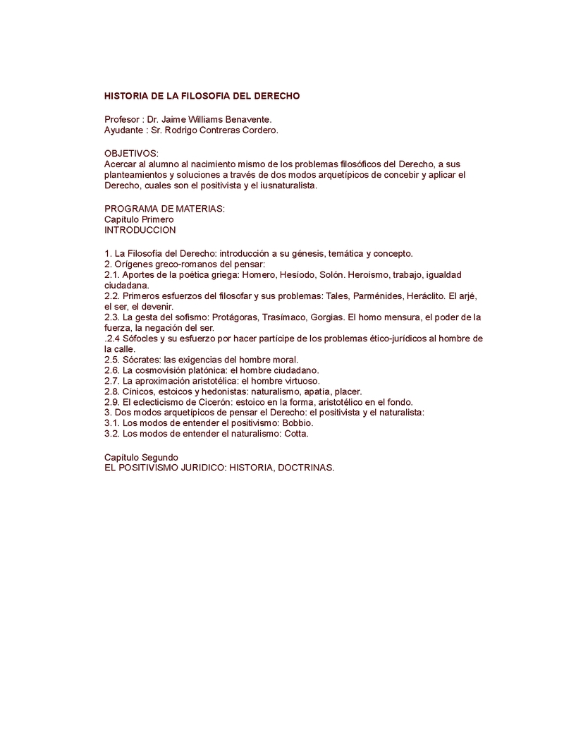 | Objetivos | Acercar al alumno al nacimiento mismo de los problemas filosóficos del Derecho, a sus planteamientos y soluciones a través de dos modos arquetípicos de concebir y aplicar el Derecho, cuales son el positivista y el iusnaturalista. | |