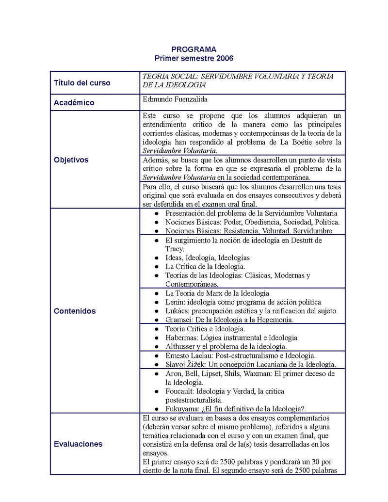 | Descripción | ASIGNATURA: TEORIA SOCIAL. Carácter: Electivo Semestre / Año: Primer Semestre 2006 Profesor Responsable: Edmundo Fuenzalida Faivovich Ayudante: Daniel Soriano Correa |