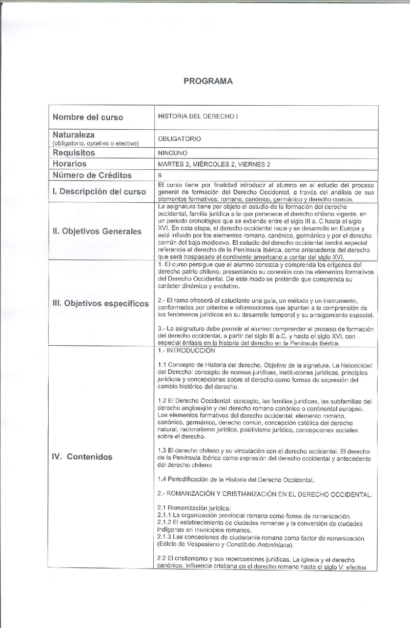 | Objetivos | OBJETIVOS GENERALES La asignatura tiene por objeto el estudio de la formación del derecho occidental, familia jurídica a la que pertenece el derecho chileno vigente, en un periodo cronológico que se extiende entre el siglo III a. C hasta el siglo XVI. En esta etapa, el derecho occidental nace y se desarrolla en Europa y está influido por los elementos romano, canónico, germánico y por el derecho común del bajo medioevo. El estudio del derecho occidental tendrá especial referencia al derecho de la Península Ibérica, como antecedente del derecho que será traspasado al continente americano a contar del siglo XVI. OBJETIVOS ESPECIFICOS 1. El curso persigue que el alumno conozca y comprenda los orígenes del derecho patrio chileno, presentando su conexión con los elementos formativos del Derecho Occidental. De este modo se pretende que comprenda su carácter dinámico y evolutivo. 2.- El ramo ofrecerá al estudiante una guía, un método y un instrumento, conformados por criterios e informaciones que apuntan a la comprensión de los fenómenos jurídicos en su desarrollo temporal y su arraigamiento espacial. 3.- La asignatura debe permitir al alumno comprender el proceso de formación del derecho occidental, a partir del siglo III a.C. y hasta el siglo XVI, con especial énfasis en la historia del derecho en la Península Ibérica. |