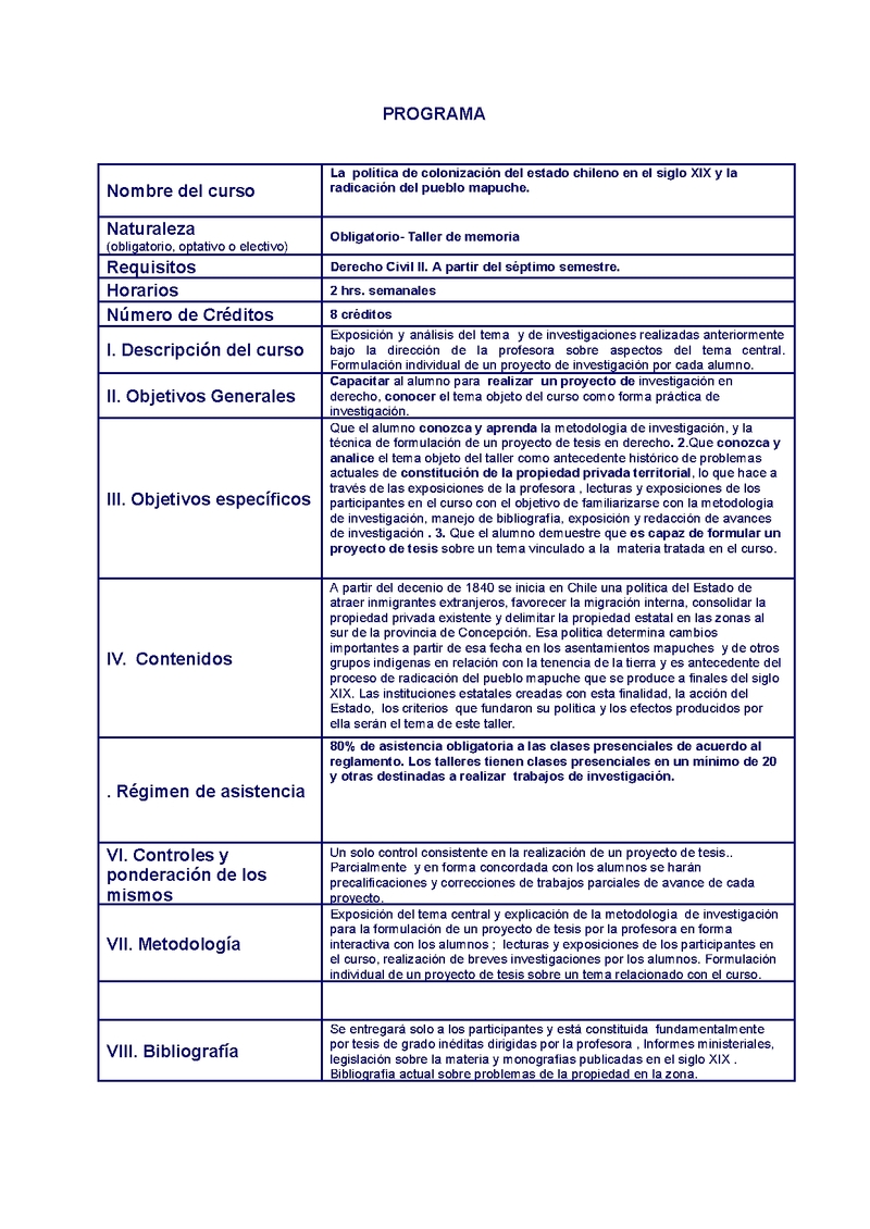 D121T07208-21 Taller la Politica de Colonizacion del Estado Chileno en el Siglo XIX y la Radicacion del Pueblo Mapuche 2011, Primer Semestre