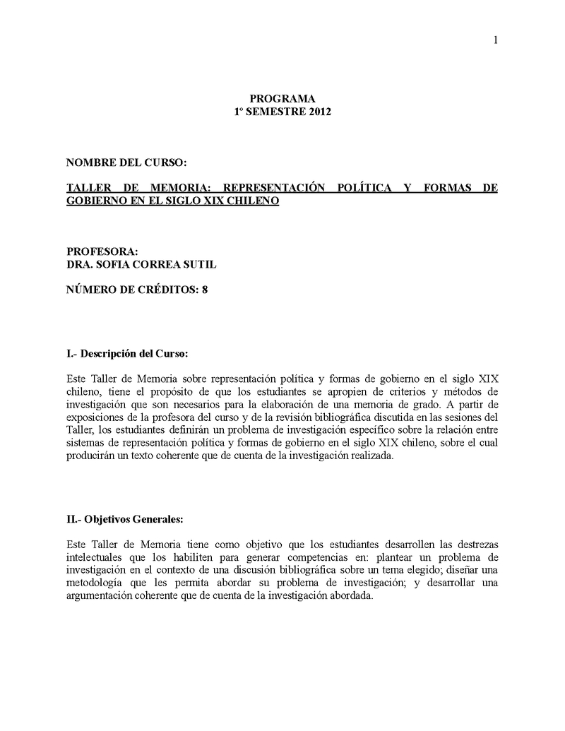 D121T07221-40 Taller Representacion Politica y Formas de Gobierno en el Siglo XIX Chileno 2012, Primer Semestre