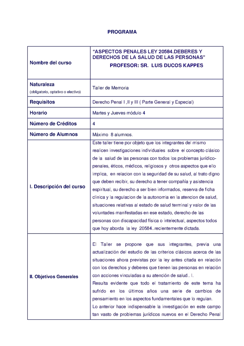D125T07336-21 Taller Aspectos Penales Ley 20.584, Deberes y Derechos de la Salud de las Personas 2013, Primer Semestre