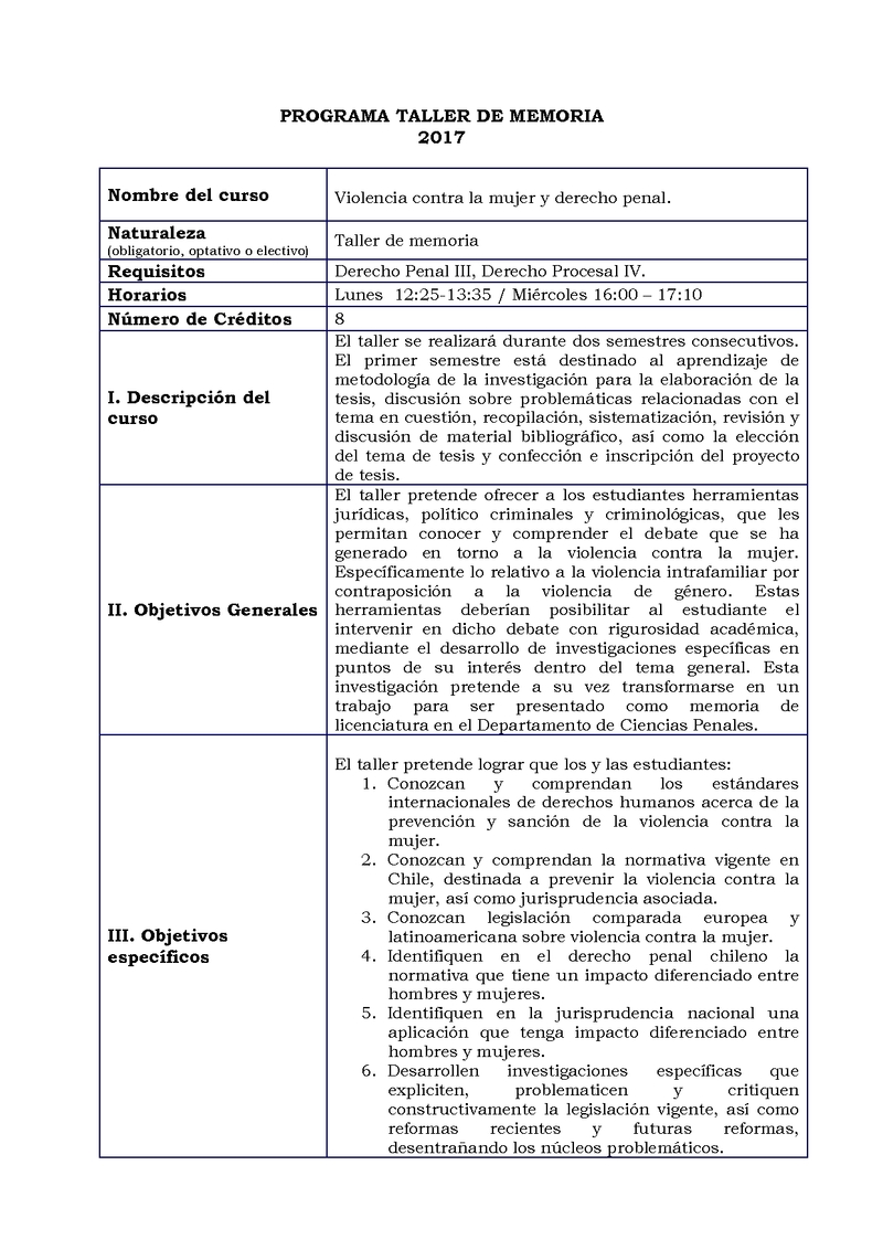 D125T07681-1 Taller Violencia contra la mujer y Derecho Penal. Parte II 2017, Segundo Semestre